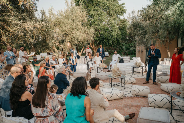 Pour des moments plus sophistiqués ou féériques, le patio magnifiquement décoré est un lieu d’exception. Ses nombreux éclairages créent une ambiance mystérieuse et romantique, qui rappelle la splendeur de Marrakech. Ce décor raffiné, avec ses arches et ses jeux de lumière, transforme chaque soirée en une expérience unique. Que ce soit pour un dîner élégant ou une soirée dansante, le patio offre une atmosphère chaleureuse et intime, où chaque détail est pensé pour sublimer l'événement.